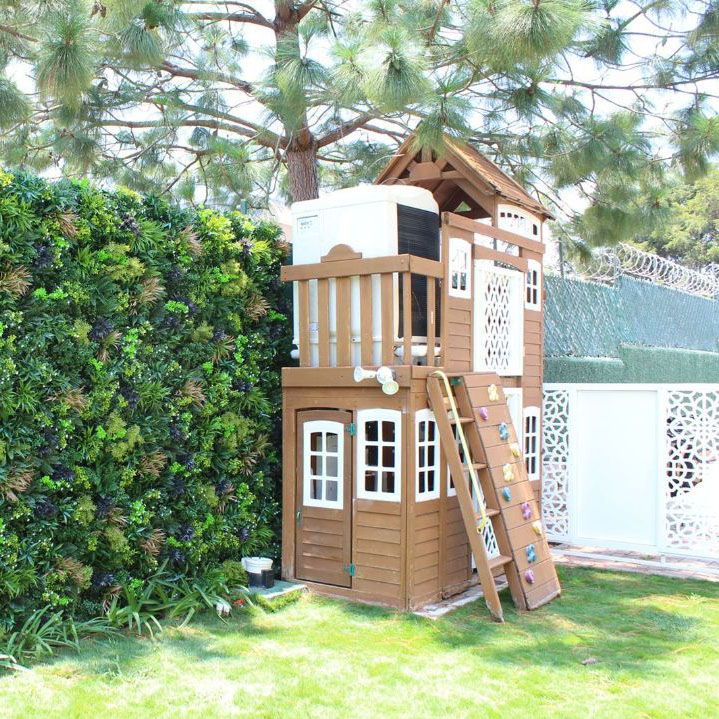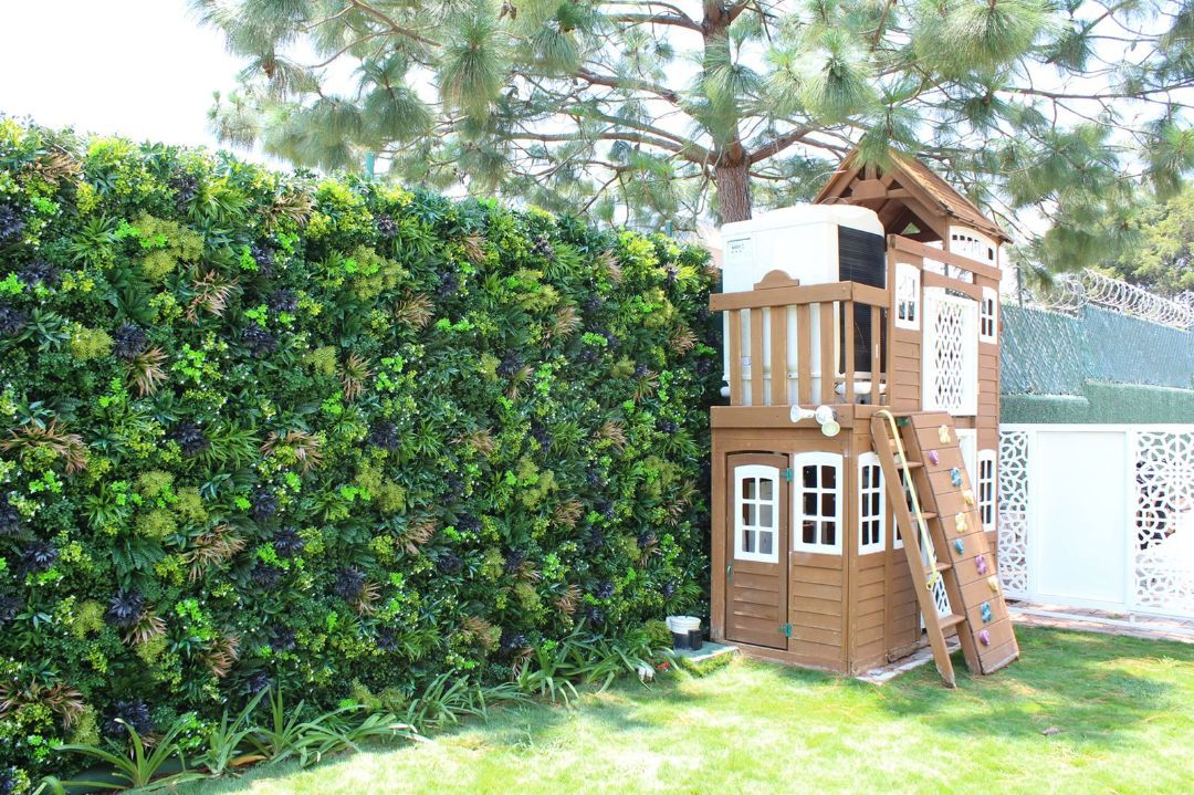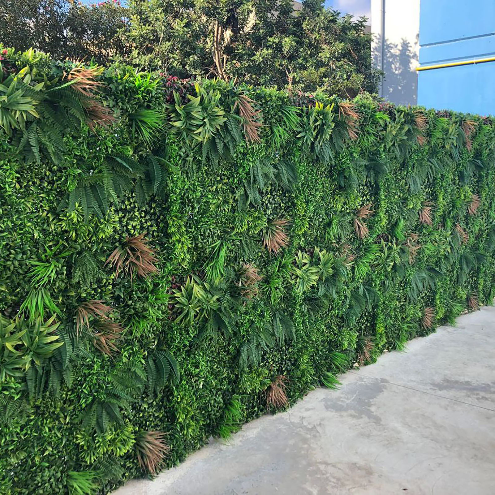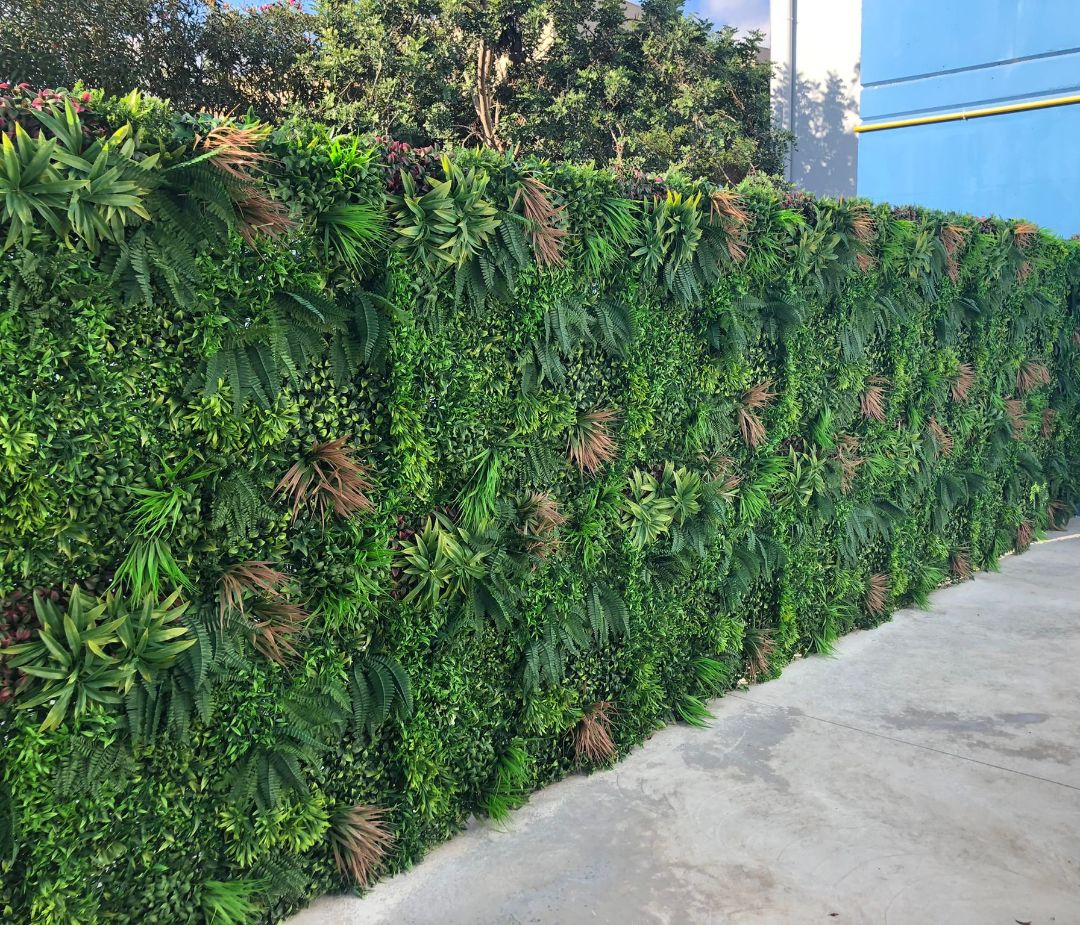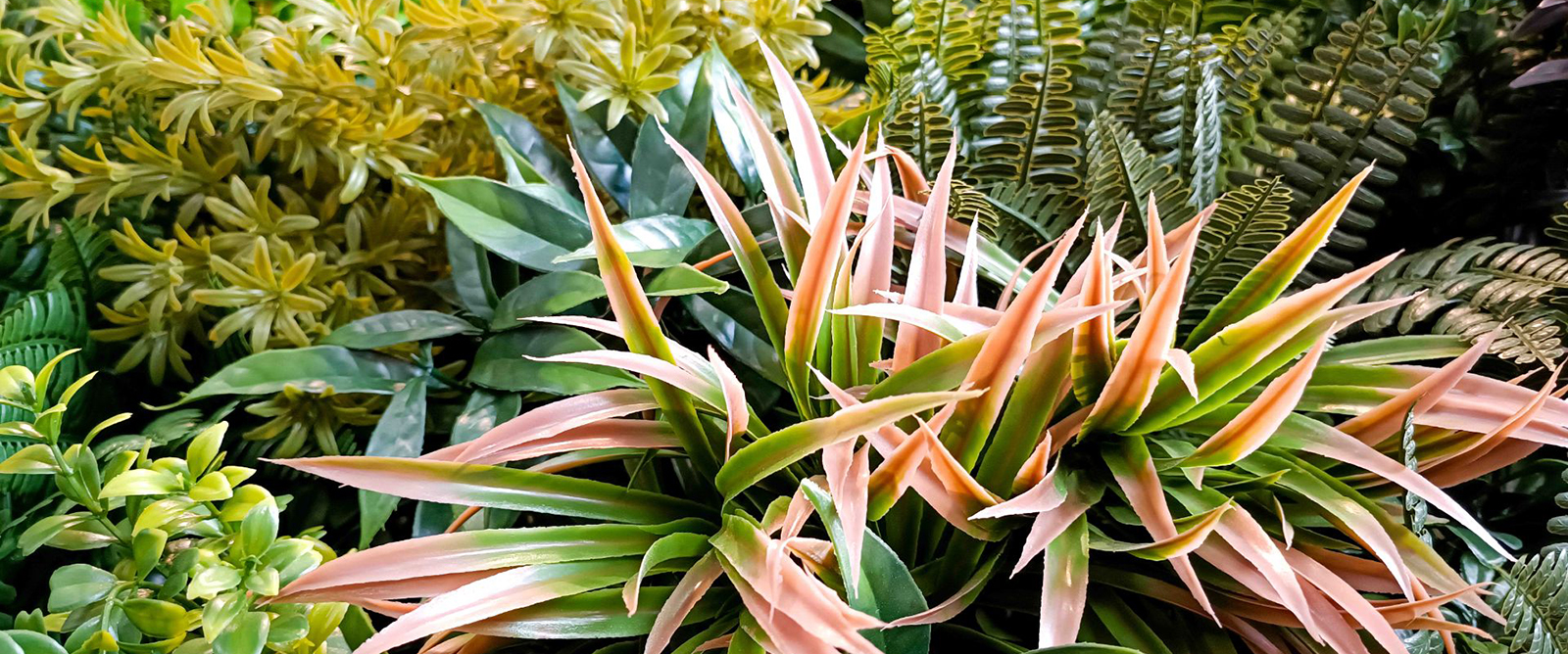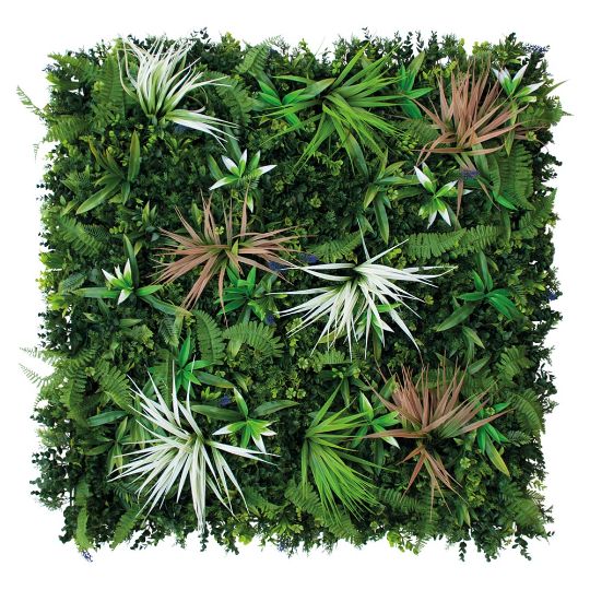 Este jardín vertical nos transporta al corazón de la Amazonia a través de su diversidad de hojas y sus tonos tropicales húmedos, contrastando con un toque de bromelias intensamente naranjas, blancas y verdes.